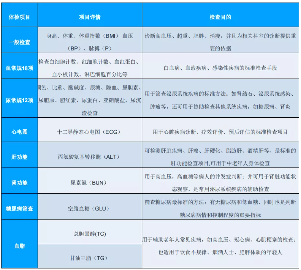 【3】本次体检从老年人常见疾病出发设计专业套餐,检查老年人的常见疾病,如肝/肾异常,血糖血脂血压异常等,原价470元父母孝心体检套餐,现在免费体验,体检项目如下:
