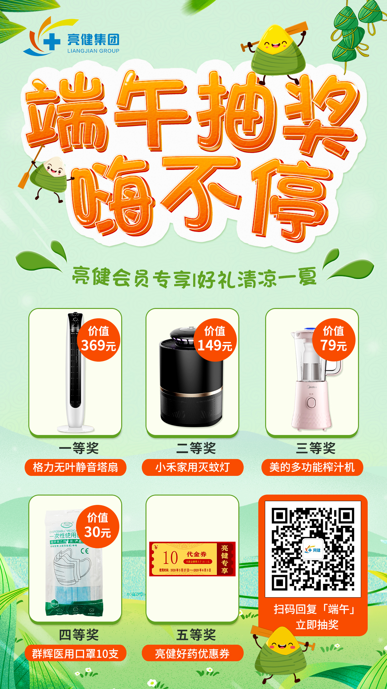 抗疫是一场长期战,需要我们共同努力。亮健会员专享“端午抽奖High不停”正在火热进行中。医用口罩、黑科技灭蚊灯、格力爆款无叶风扇、美的榨汁机、10元无门槛购药优惠券通通免费送!