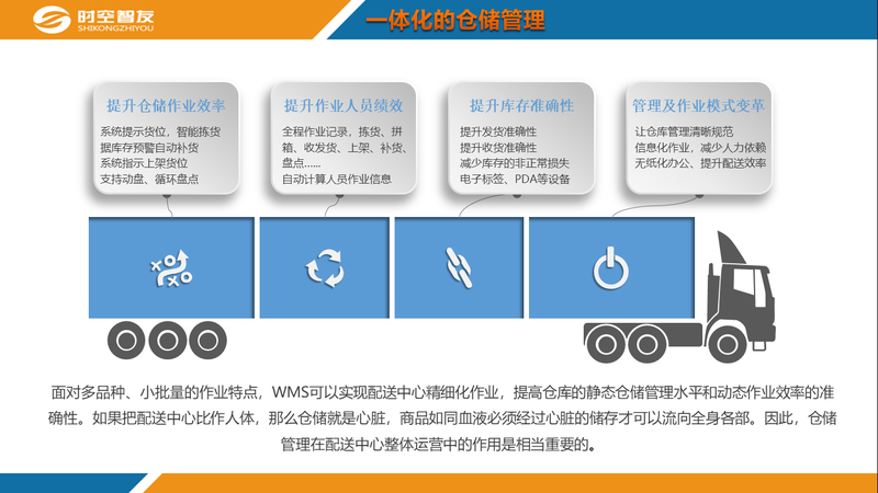 对于仓储现场管理,将有效提升仓库流程的标准化、现场管理的透明化,实现对成本的精细化管理;对于销售与运营,通过对订单、发货等全过程的管理与统计,对商品状态全过程跟踪,将提高公司对客户的服务能力及对市场的应变能力;对于财务管理,将有效实现财务业务一体化,为财务管理提供精准的、完整的业务数据依据;对于采购管理,能有效实时监测供应商的按时供货率,合理降低采购成本,提高采购效率。