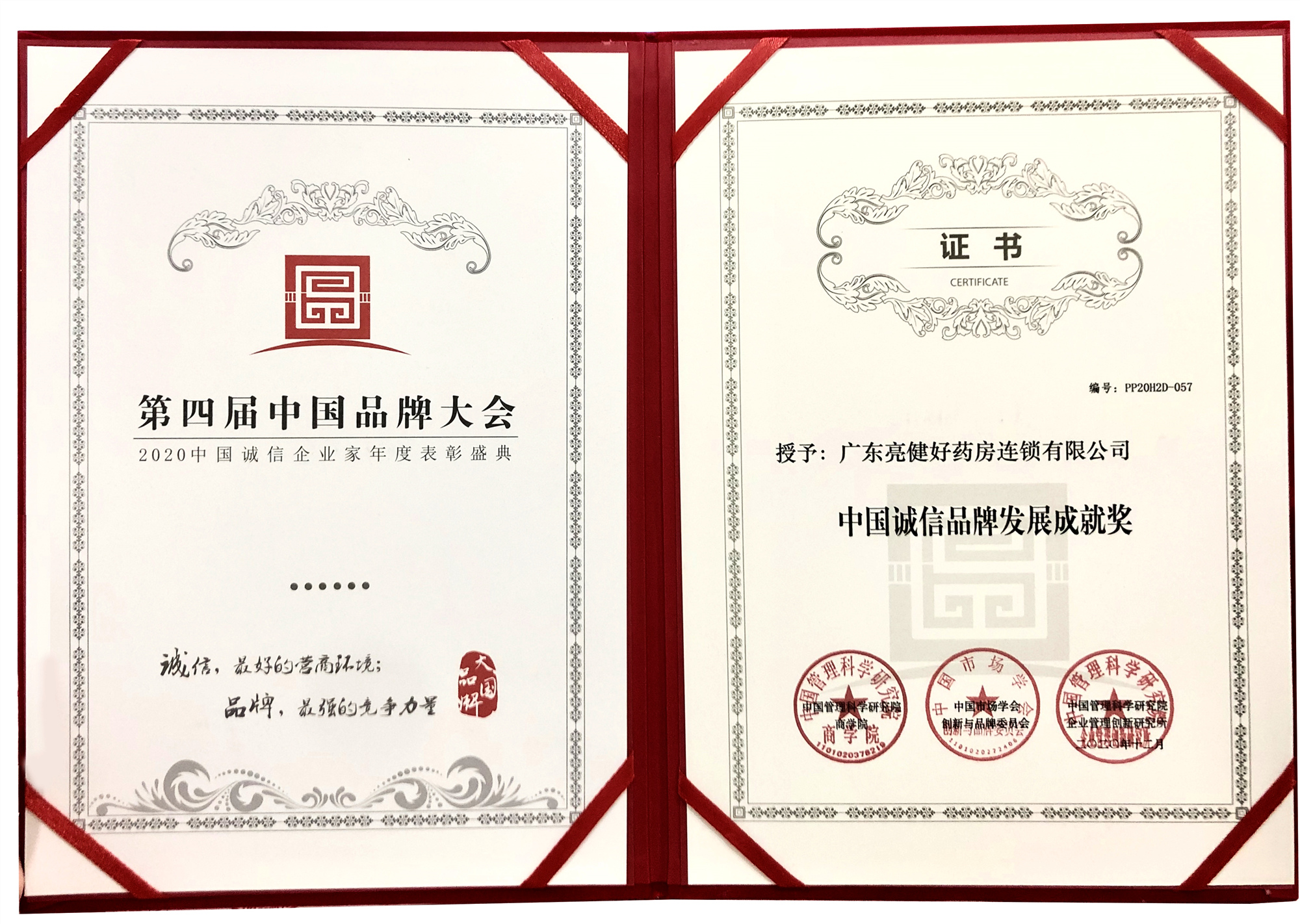 在中国科学家论坛2020科技赋能品牌院士论坛上,中国管理科学研究院企业管理创新研究所赵先贵书记为亮健颁发了”中国大健康产业先锋企业“、”中国诚信品牌发展成就奖“,并授予公司董事长谢文先生”诚信品牌中国十大企业家“荣誉称号,以表彰亮健在推动行业健康发展,技术创新、诚信经营所做出的突出贡献。