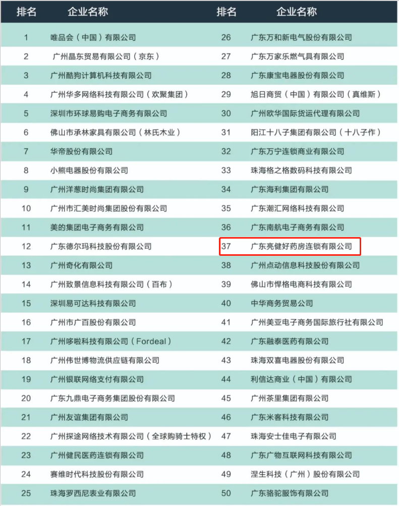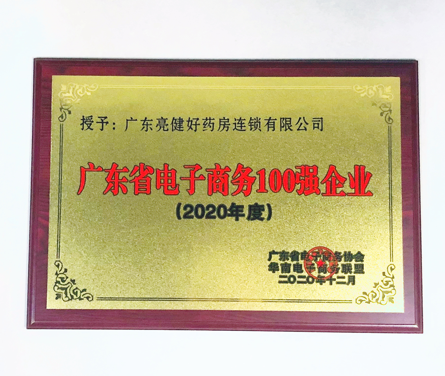 2021年1月20日,广东省电子商务协会举行2021年新春年会,并现场颁发了2020年度电商100强部分代表企业,亮健集团旗下广东亮健好药房连锁有限公司凭借实力入榜,排名位列前40强,集团总经理朱自林先生受邀出席。